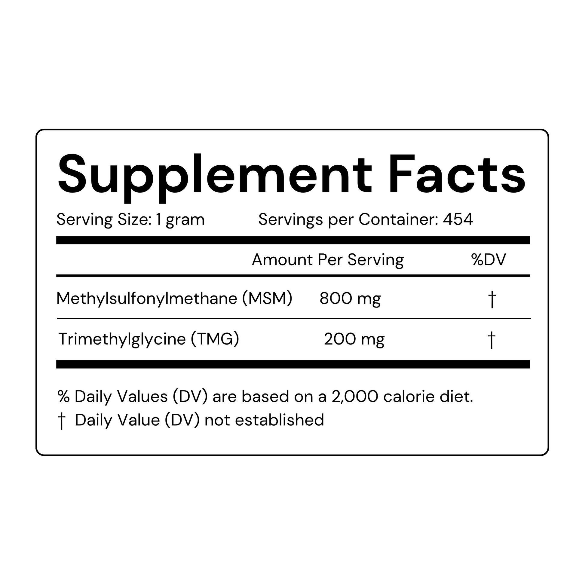 This advanced formula combines MSM (Methylsulfonylmethane) — a bioavailable sulfur compound — with Trimethylglycine (TMG) and synergistic B-vitamins to help regulate homocysteine levels, promote healthy connective tissue, and support liver detox pathways.