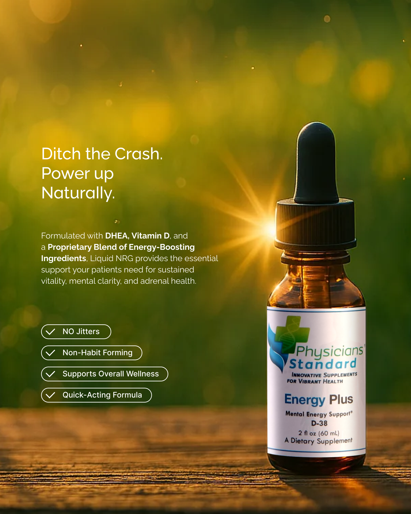 Energy Plus (D-38) is a balanced, non-jittery energy support formula that combines bioidentical hormones, adaptogenic herbs, and botanical nutrients to promote sustained physical and mental energy without overstimulation. Designed to enhance alertness, stamina, and focus, it supports adrenal resilience and mitochondrial function for optimal vitality throughout the day.