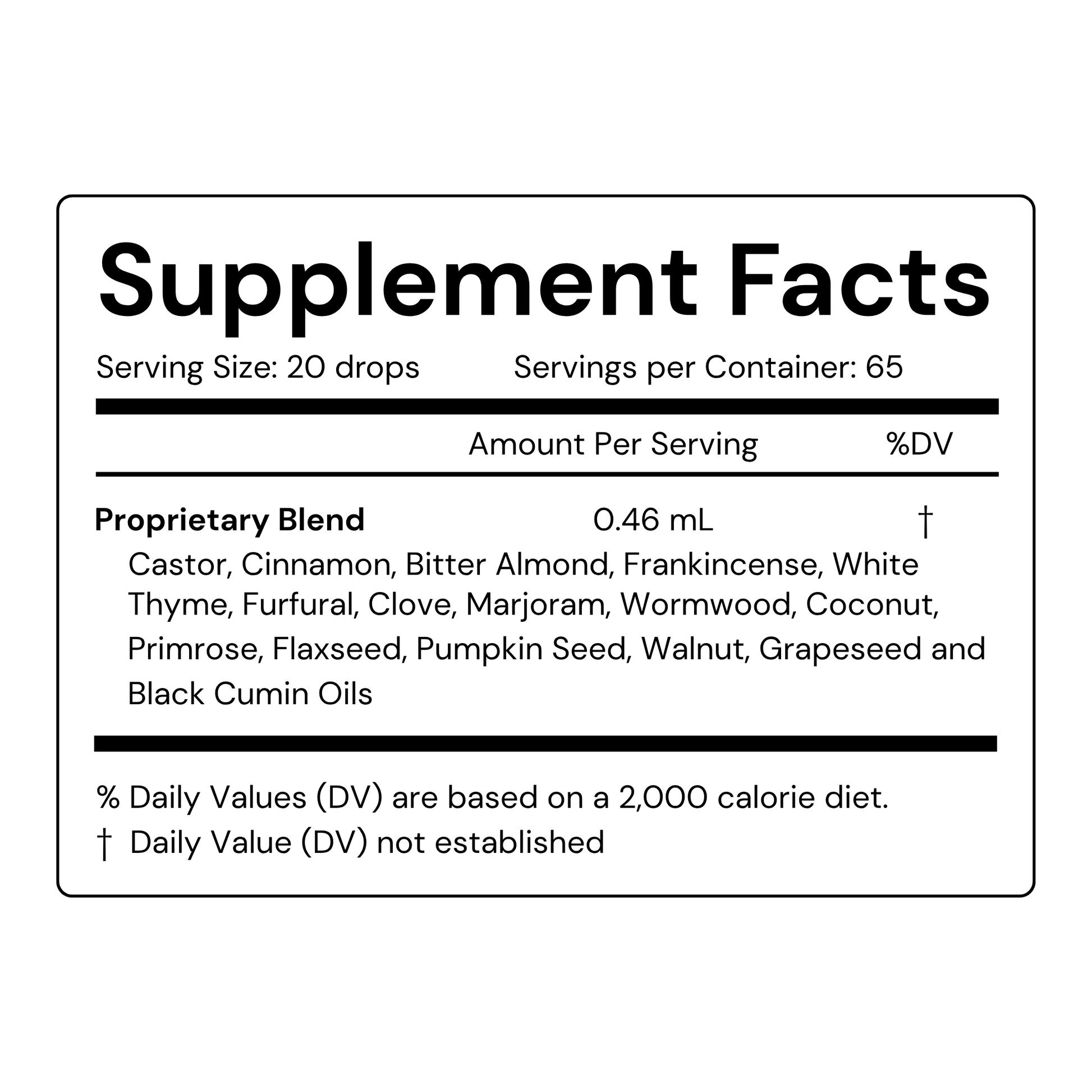Take 20 drops with 2oz of water, or in a 00 vegetarian capsule, 3 times a day.